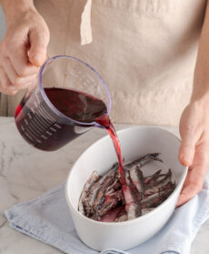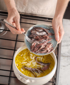 Appena l'olio sfrigola e prima che l'aglio scurisca, unite le acciughe. Versate ancora un bicchiere d'olio e cuocete 30 minuti facendo attenzione che non frigga.