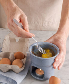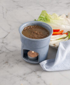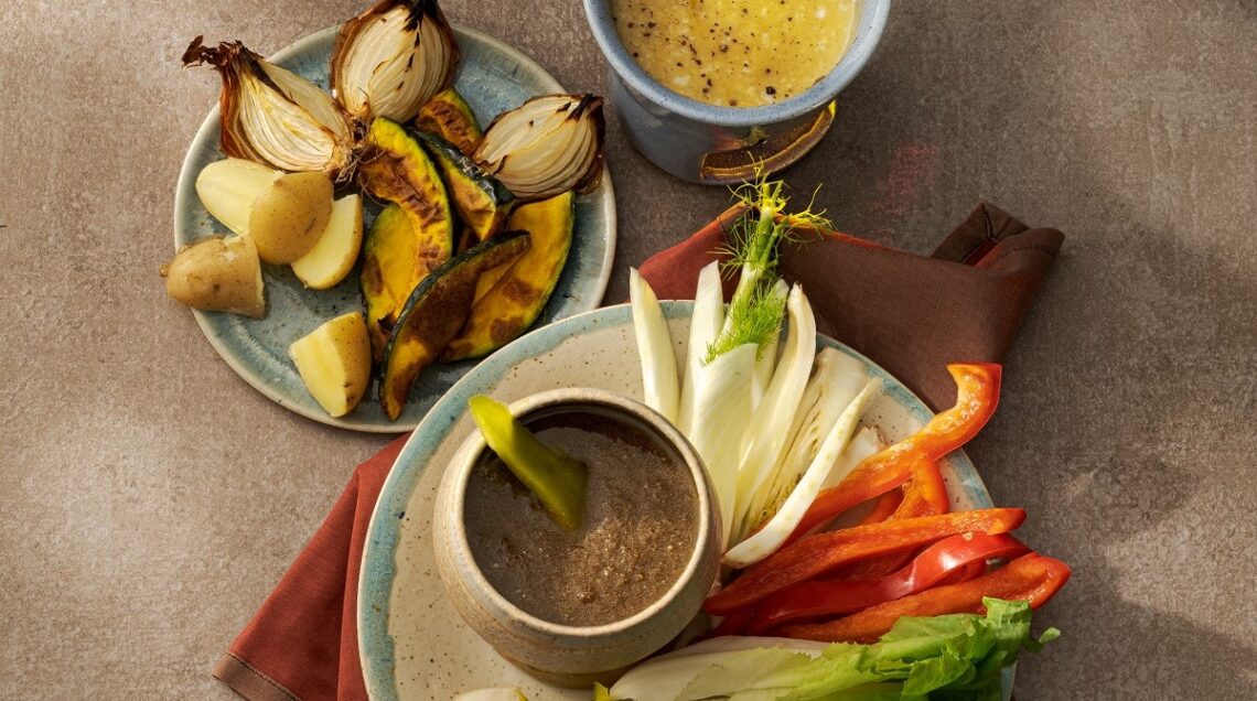Distribuite la bagna caôda preparata in 4 scaldini di coccio individuali e disponeteli in tavola sui loro fornellini; accompagnate con verdure crude mondate e tagliate a falde o a pezzi per il lungo (peperoni, scarola, topinambur, cavolo bianco, carote) e con verdure cotte (barbabietole al forno, patate lesse, cipolle al forno, zucca al forno) o, ancora, polenta fritta.