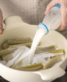 Pulite le coste di cardi, tagliatele a tronchetti e prelessatele. Sistematele in un tegame, copritele di latte, condite con sale, pepe e noce moscata e portatele a completa cottura unendo, se necessario, altro latte.