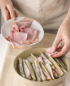 Sistemate uno strato di cardi in una pirofila imburrata, distribuitevi sopra qualche fettina di prosciutto di Praga e di scamorza affumicata e coprite con i restanti cardi, fiocchetti di burro e una spolverata di grana grattugiato. Fate gratinare in forno a 200° per 15-20 minuti.