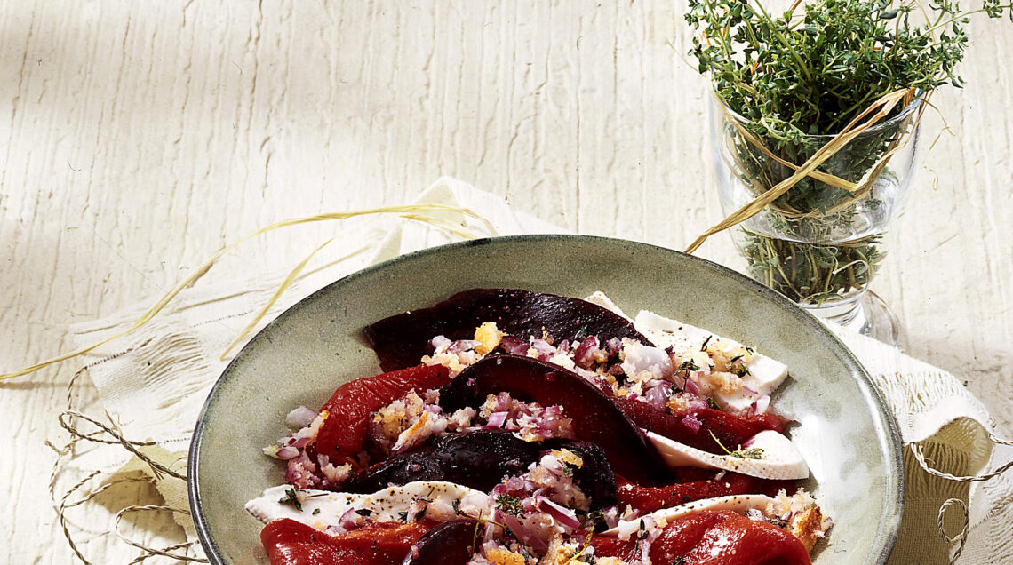 3) Disponi le verdure e le fette di primosale alternate su un piatto che possa essere messo in forno. Trita la cipolla insieme al pancarré e al timo e cospargi con il composto il carpaccio. Sala, pepa, versa un filo d'olio e metti a gratinare per qualche minuto sotto il grill del forno finché il composto di pancarré sarà dorato.