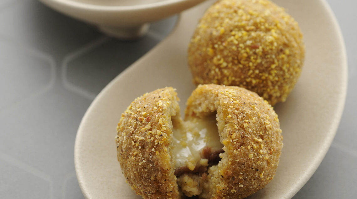 Nella dolcezza del puré si scopre il sapore deciso del formaggio e dell'acciuga. Un velo di farina di mais rende i bocconcini croccanti e irresistibili