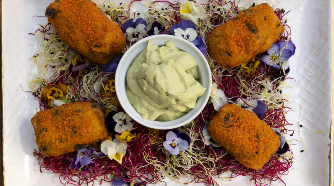 6 Create un letto con i germogli e i fiori, disponete le crocchette a piacere e accompagnate con la maionese.