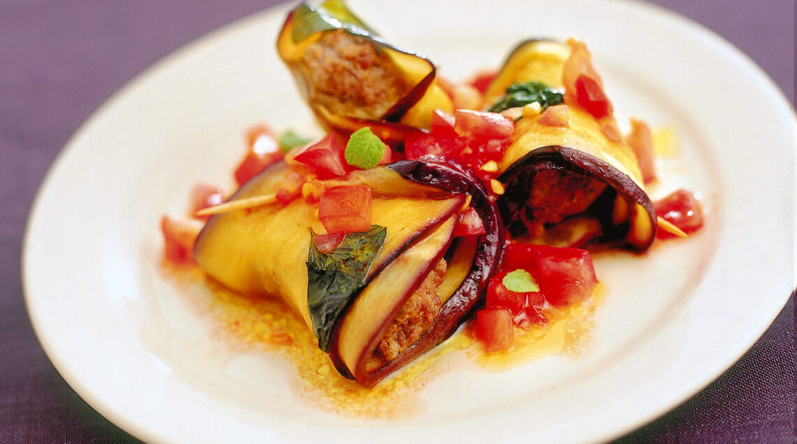 2) Affetta sottilmente le melanzane nel senso della lunghezza, scottale in acqua bollente, asciugale e sovrapponi le fette a 2 a 2; appoggiavi le polpettine e chiudile a fagottino con stecchini di legno.