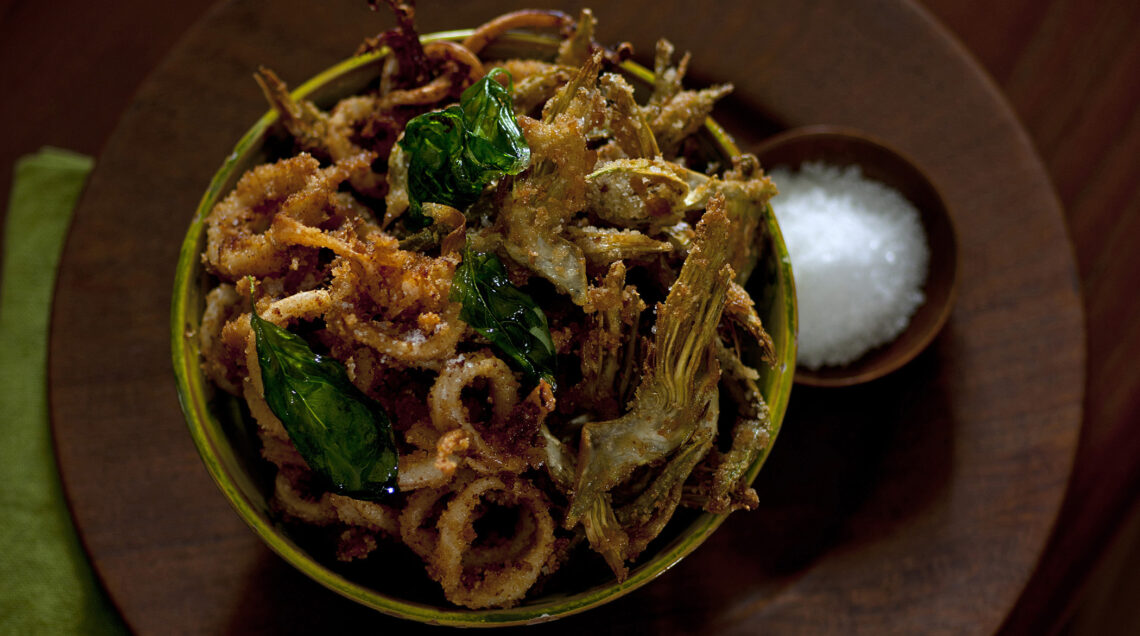 4 Sbattete leggermente gli albumi con un pizzico di sale e pepate. Immergetevi, pochi alla volta, sia i calamari sia i carciofi ben sgocciolati, passateli nelle briciole di pane, poi friggeteli in abbondante olio ben caldo, finché risulteranno dorati.