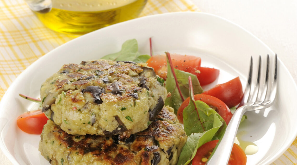 3) A questo punto comincia a formare tante polpette piatte. Cuoci gli hamburger in una padella con un filo di olio ben caldo e serviti il tuo hamburger di melanzane insieme a un'insalatina e pomodorini a spicchi.