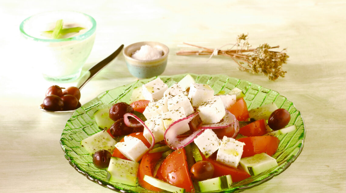 3) Condisci l'insalata alla greca con l'aceto, l'olio extravergine di oliva, una presa di sale e una macinata di pepe. Infine profuma con abbondante origano, mescola con delicatezza e servi.