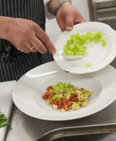 4) Aggiungi le verdure, unisci il condimento, mescola, impiatta e guarnisci con fettine di speck croccanti, erba cipollina e foglie di sedano.