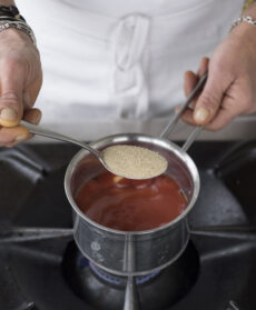 Nel frattempo, in un pentolino, fate soffriggere 2 spicchi d'aglio in 3 cucchiai d'olio, unite la passata di pomodoro, 1 cucchiaino raso di zucchero, 1 pizzico di peperoncino e aggiustate di sale; poi, fate cuocere fino a ottenere una salsa densa.