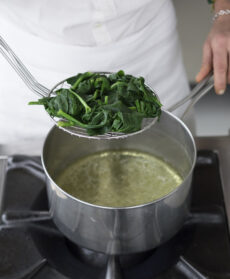 In una casseruola, portate a ebollizione abbondante acqua, sbollentate gli spinaci e scolateli; strizzatene bene 2/3 e il resto tenetelo da parte.