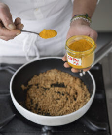 A parte, in una padella antiaderente, fate dorare il pangrattato con 2 cucchiai d'olio extravergine d'oliva, 1 pizzico di sale e 1 spicchio d'aglio. Aggiungete 1 cucchiaino di curcuma e mescolate fino a quando il pangrattato ha preso un bel colore giallo.