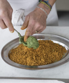 Prelevate 1 cucchiaio alla volta dell'impasto preparato, passatelo nel pangrattato alla curcuma e, aiutandovi con le mani, formate tanti medaglioni impanati.