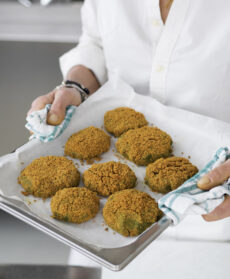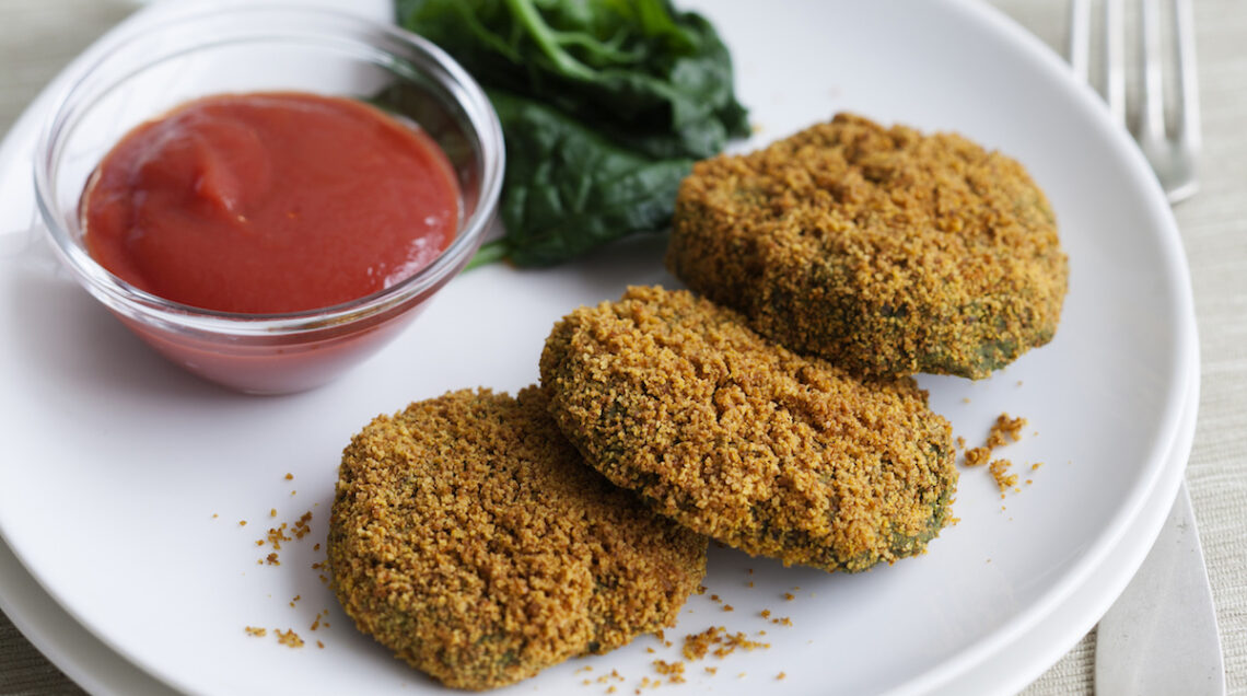 Hanno il profumo delle spezie d'Oriente questi medaglioni di legumi e spinaci. Al cumino e al curry, si aggiunge la nota piccante del peperoncino. La panatura alla curcuma regala il colore dorato, in piacevole contrasto con il rosso della salsa. Un secondo vegetariano al forno, gustoso e sano