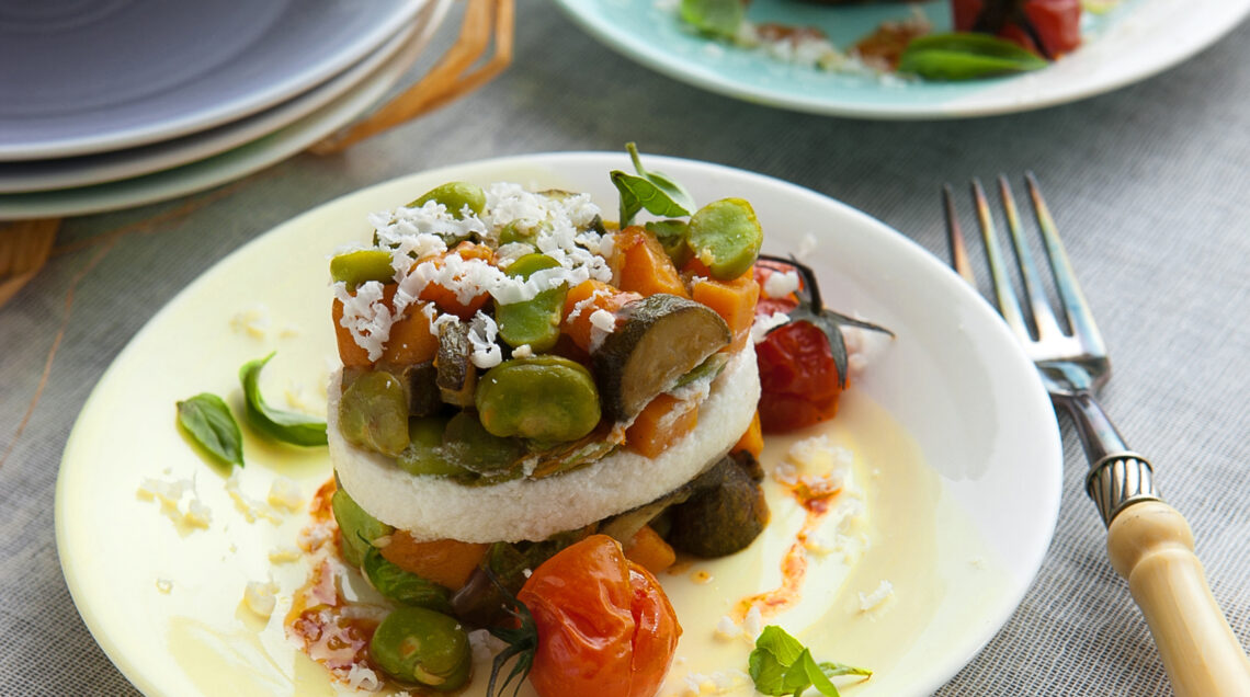 3) Riempi 4 coppapasta ovali con uno strato di verdure, premendole con il dorso del cucchiaio; ritaglia le fette di ricotta di bufala in misura, disponile nei coppapasta e copri con le verdure rimaste.