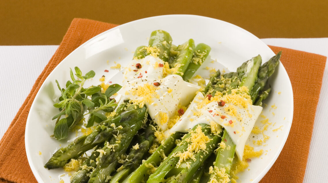 2) Dividi gli asparagi in 8 mazzetti e avvolgili ciascuno con una fetta di formaggio, subito e velocemente in modo che il formaggio si sciolga con il calore; sistema i mazzetti in 4 piatti.