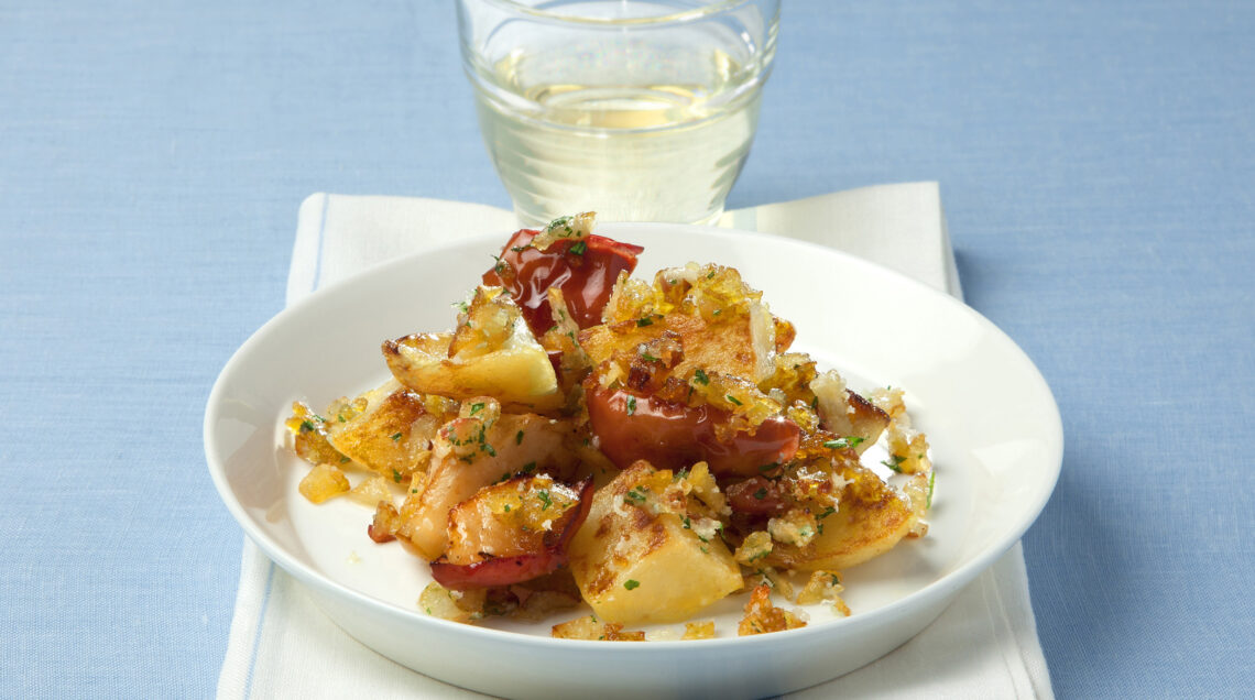 2) Scottate in acqua bollente salata 400 g di patate a cubetti per 6 minuti, tenetene da parte mezza perché vi servirà per completare il piatto. Sgocciolatele e mescolatele con le 2 mele rosse acidulate, 2 spicchi d'aglio schiacciati (con la buccia), olio e sale. Cuocete in forno caldo a 200°C per 20 minuti.