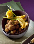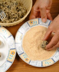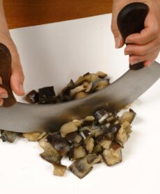 Lava e spunta le melanzane, affettale, salale e lasciale spurgare per 30 minuti. Trascorso questo tempo, sciacqua le melanzane, asciugale e tagliale a tocchetti, quindi lasciale cuocere a vapore per circa 8 minuti. Una volta cotte, mettile da parte per farle raffreddare e poi tritale con una mezzaluna.