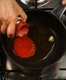 Scalda l'olio extravergine di oliva con 1 spicchio di aglio, aggiungi la passata di pomodoro, un pizzico di sale e pepe e le foglie di basilico ben sminuzzate. Lascia cuocere la salsa finché sarà piuttosto densa e servi le polpette di melanzane coperte dalla salsa al pomodoro ben calda.