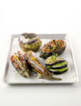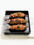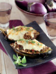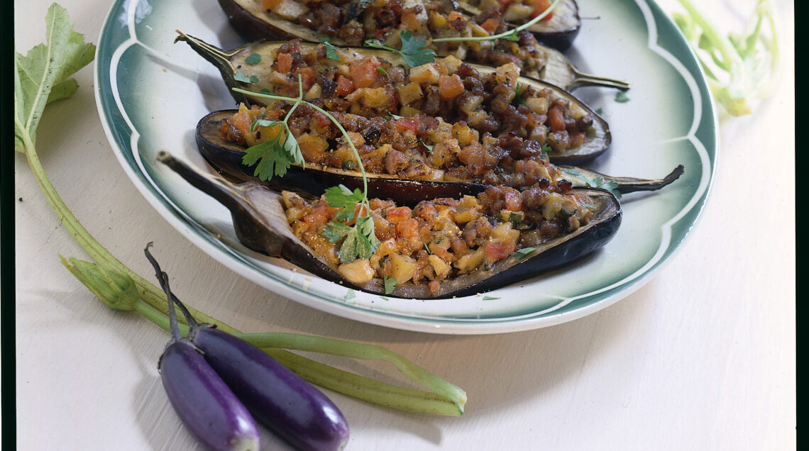 5) Farcisci le barchette di melanzane con il composto preparato, sistemale in una teglia che le contenga di misura e passale in forno caldo a 180° per 10 minuti. Servile calde o tiepide, volendo come antipasto.