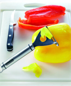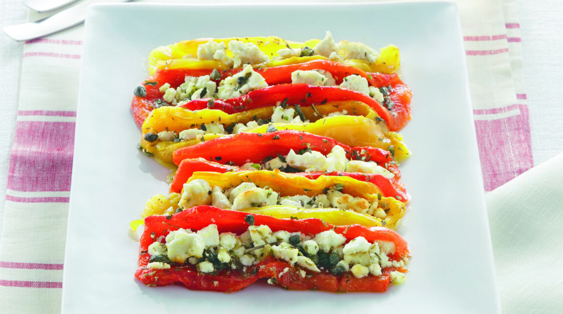 1) Metti a bagno i capperi in una ciotola con acqua calda. Lava e asciuga i peperoni, pelali con un pelapatate cercando di asportare solo la buccia, elimina il picciolo e tagliateli a metà. Elimina semi e filamenti interni e riducili a falde. Trasferiscili in una terrina e condiscili con un pizzico di sale e 4-5 cucchiai di olio.