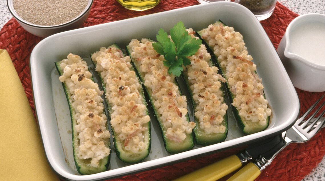 4 Riempi le zucchine con l’impasto ottenuto e sistemale in una teglia con un filo d'olio. Cospargi con burro a fiocchetti e pangrattato e inforna a 200° per circa 20 minuti. Sforna e lascia intiepidire le zucchine prima di servirle in tavola.