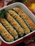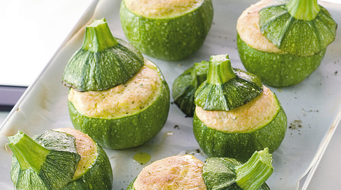 3 Riempi le zucchine con la farcitura ottenuta e disponile in una teglia foderata con carta da forno bagnata e strizzata. Chiudi le zucchine ripiene vegetariane con le calotte tenute da parte e cuocile in forno caldo a 180° per 30 minuti circa. Servi le zucchine calde o a temperatura ambiente.