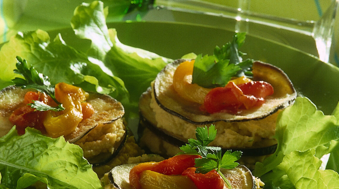 4) Sovrapponi a 3 a 3 le fette di melanzana, spalma le prime 2 con uno strato di crema di ceci, decora con i peperoni a filetti e il basilico e servi finalmente i sandwiches di melanzane ai ceci.