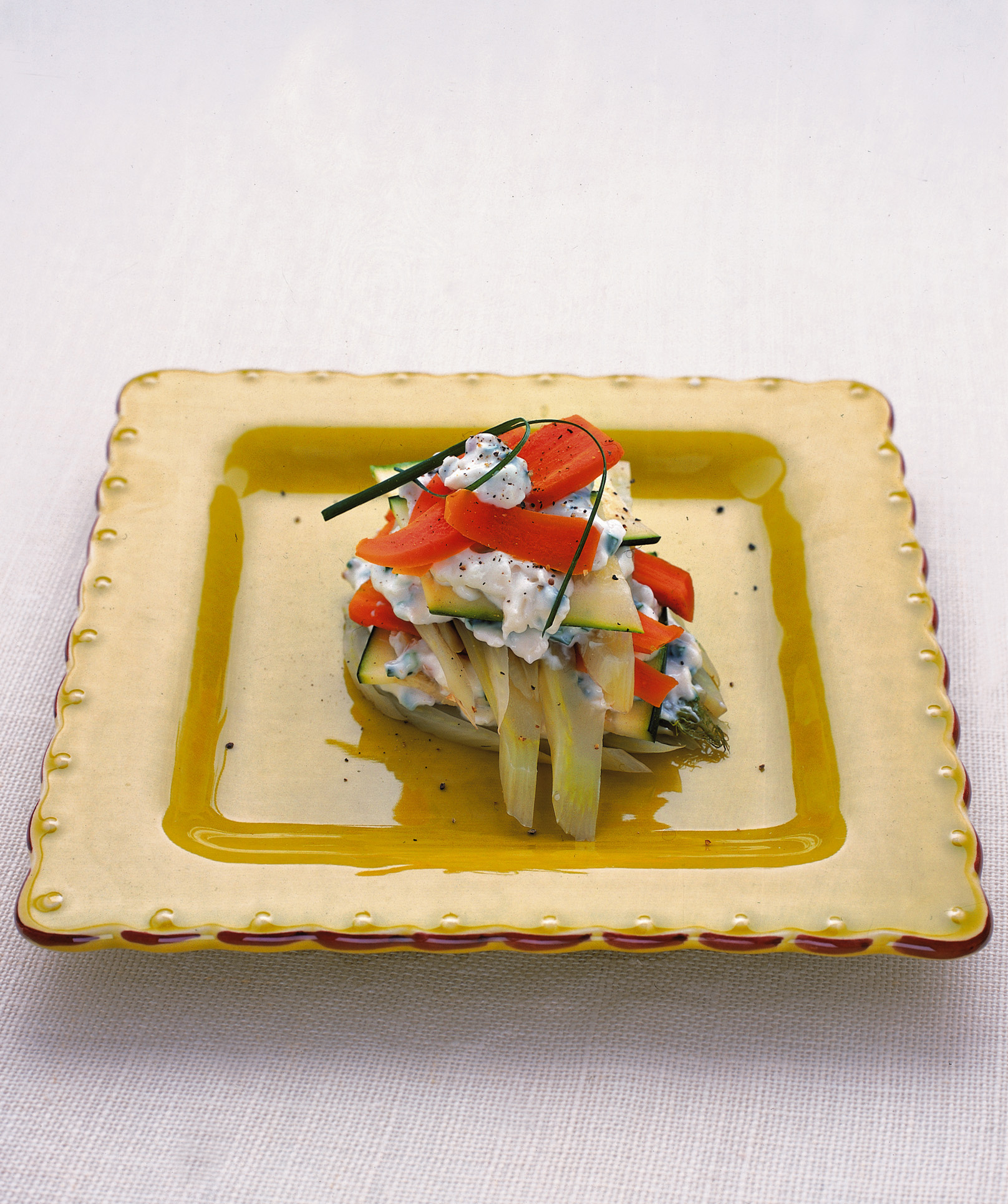 3) Alterna all'interno dei piatti strati di verdura e formaggio; irrora le sfogliate di verdure al caprino con un filo d'olio, aggiungi una macinata di pepe e servi in tavola.
