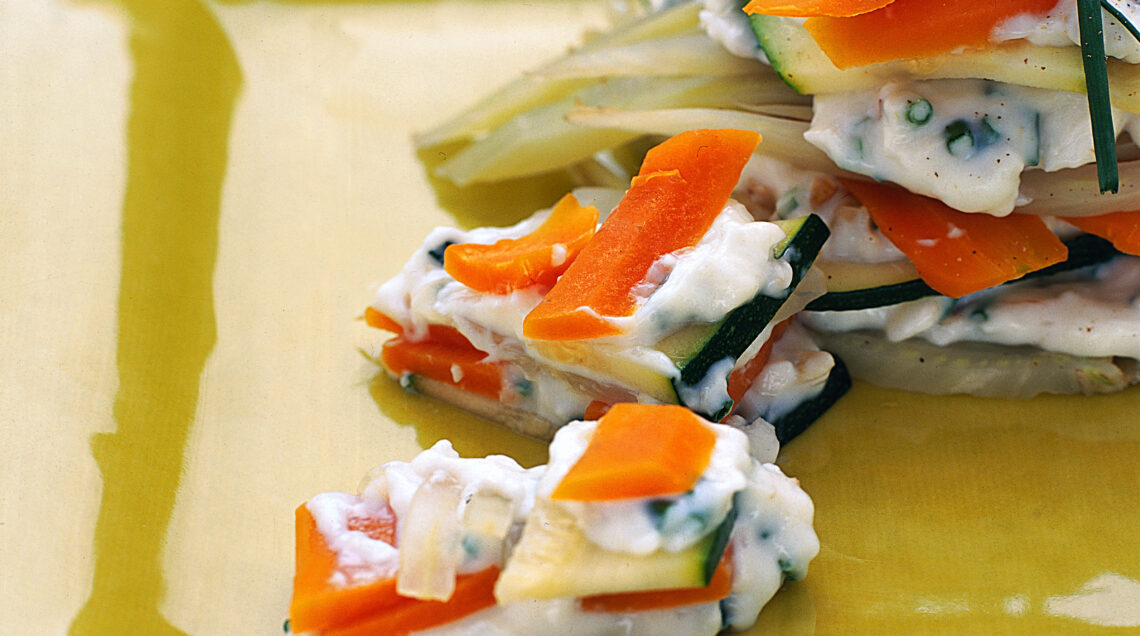 1) Taglia il finocchio, la carota e la zucchina che serviranno come base per la sfogliata a fettine sottili. Aggiungi poi sale e pepe a tutte le verdure e disponile all'interno di un cestello per la cottura al vapore, lasciandole cuocere su acqua bollente per 10 minuti, coperte.