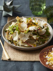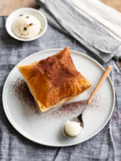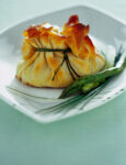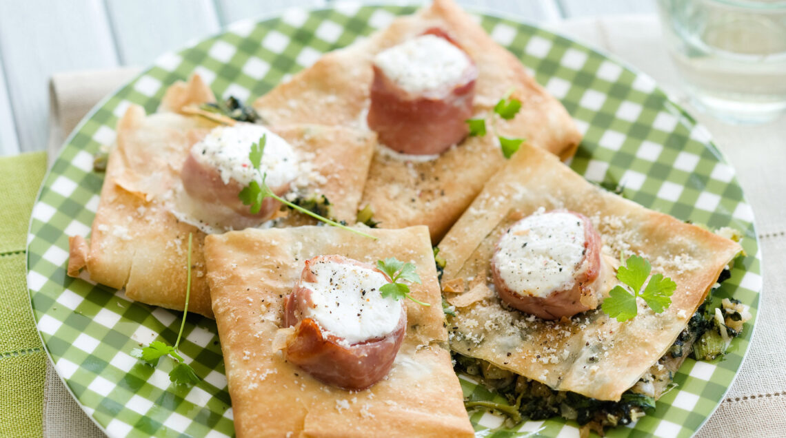 3) Avvolgi ciascun caprino con 2 fette di speck; taglialo a metà e guarnisci le sfogliette croccanti, per poi infornarle a 200° per 15 minuti. Spolverizza con pepe e parmigiano a piacere prima di servirle.