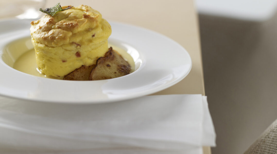 6) Al momento di gustare il soufflé di patate con fonduta e mele alla salvia, aggiungi un tuorlo e aromatizza con pepe nero e noce moscata (o ginepro). Decora il tuo piatto con salvia fritta.