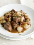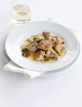 1) Monda i carciofi dalle foglie più dure, tagliali a metà, elimina il fieno interno, dividili in quarti e immergili in acqua acidulata con il succo di mezzo limone. Trita l'aglio con l'aneto (o il finocchietto) e con la parte verde del cipollotto, soffriggi dolcemente il trito in 4 cucchiai di olio, unisci i carciofi, mezzo bicchiere di acqua, sala e copri. Cuoci dolcemente finchè i carciofi sono teneri (15 minuti circa). Scolali e tienili in caldo.