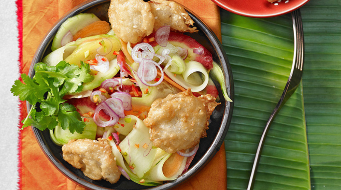 Un secondo vegano di tradizione thailandese, le frittelle di taro sono passate in una pastella a base di latte di cocco e fritte in olio di mais. Il mix di verdure crudo è perfetto per esaltarne il sapore