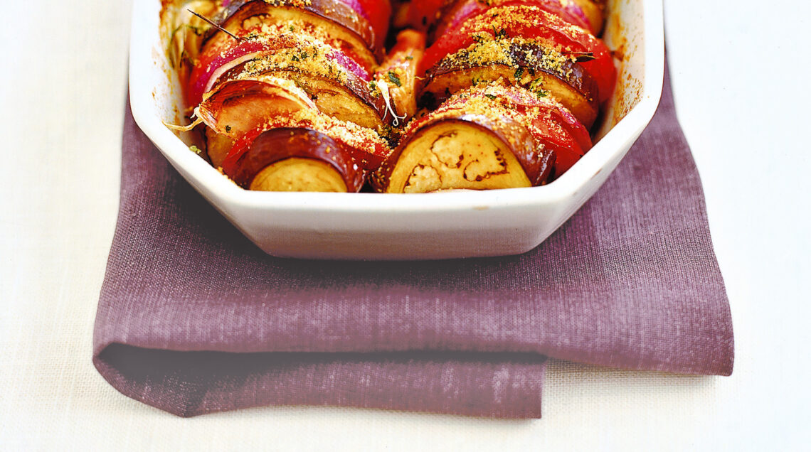 Lava i pomodori, sbuccia le cipolle e taglia entrambi come le melanzane. Disponi le verdure in file molto ravvicinate in una pirofila, alternando una fetta di melanzana, una di pomodoro e una di cipolla fino a esaurire gli ingredienti del tortino.