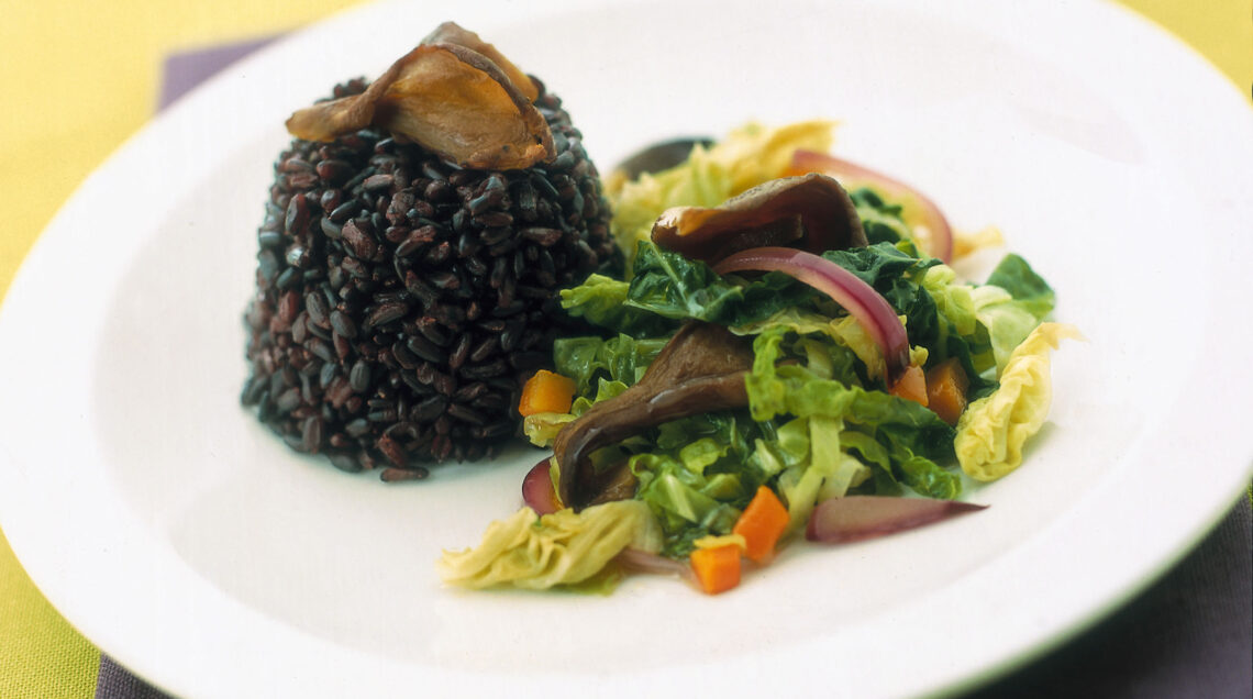 3) Filtra l'acqua dei funghi e versala in una pentola d'acqua con la salsa di soia, il soffritto tenuto da parte, il vino e il mazzetto aromatico; sala e cuocici il riso nero per 30 minuti. Dividilo negli stampini, lascialo intiepidire, sformalo e servilo con la verza stufata.