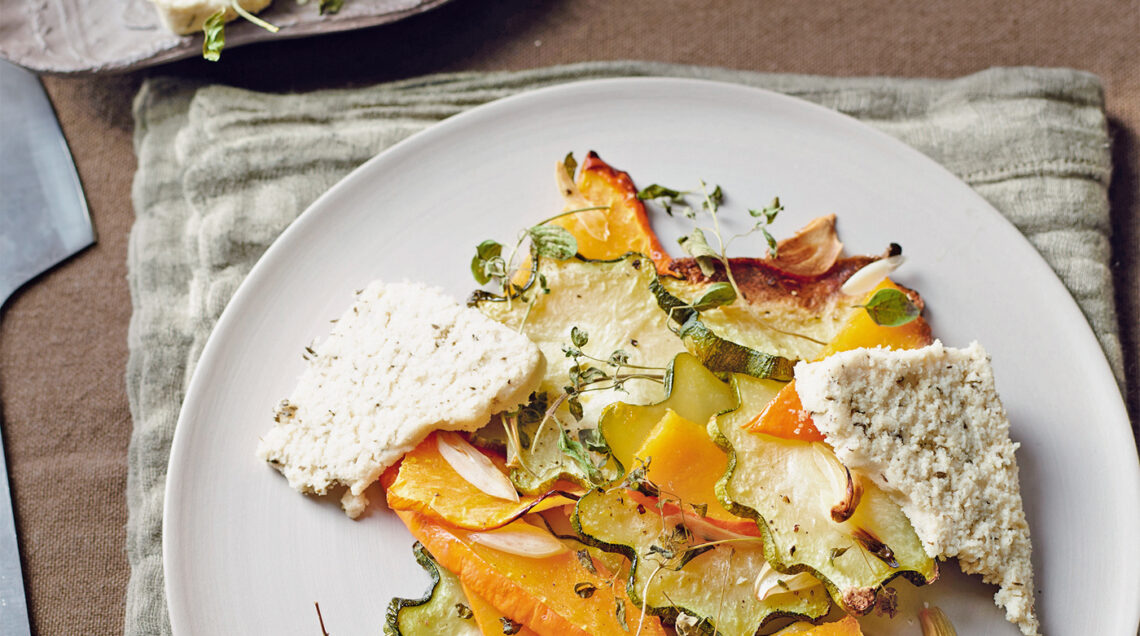 1 Pulite la zucca eliminando i semi e i filamenti, ma senza pelarla. Affettatela insieme alla zucchina a fettine di 3-4 mm di spessore.