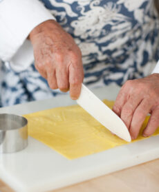 Con un coltello affilato o una rotella tagliate le sfoglie di pasta a metà in modo da ottenere dei rettangoli.