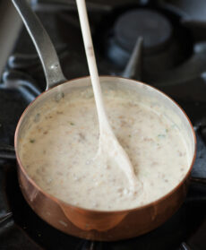 Fate fondere 50 g di burro in un pentolino, aggiungete 50 g di farina e fatela tostare leggermente, mescolando. Versate a filo 1/2 litro di latte, sempre mescolando con una frusta, portate a ebollizione e cuocete a fuoco basso per 1 minuto, tenendo la besciamella molto fluida. Salate e profumate con noce moscata.