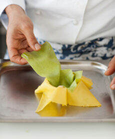 Sfoglie di pasta fresca colorata racchiudo un cuore di besciamella, salsiccia e vitello. Nappate con la crema di parmigiano, diventano scrigni gourmand