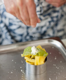 Foderate 6-8 cerchi di metallo di 8-10 cm di diametro con le sfoglie, metà bianche e metà verdi, lasciandole sbordare abbondantemente.