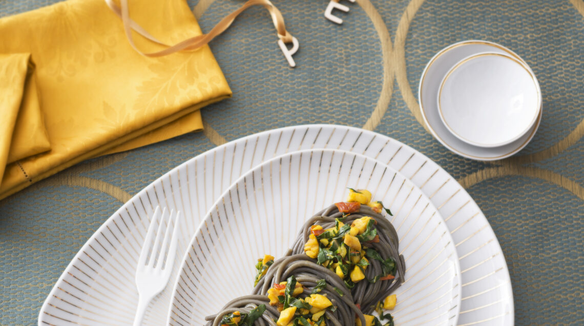 3) In una larga padella antiaderente rosolate 4 cucchiai d'olio con l'aglio schiacciato senza farlo bruciare; dopo un minuto circa unite i pomodorini poi la ricciola e subito dopo la julienne di bietole. Bagnate con la Vernaccia e 1 dl di fumetto di pesce in cui avrete sciolto lo zafferano, salate, pepate e cuocete il tutto per 2-3 minuti fino a ottenere un sughetto morbido.