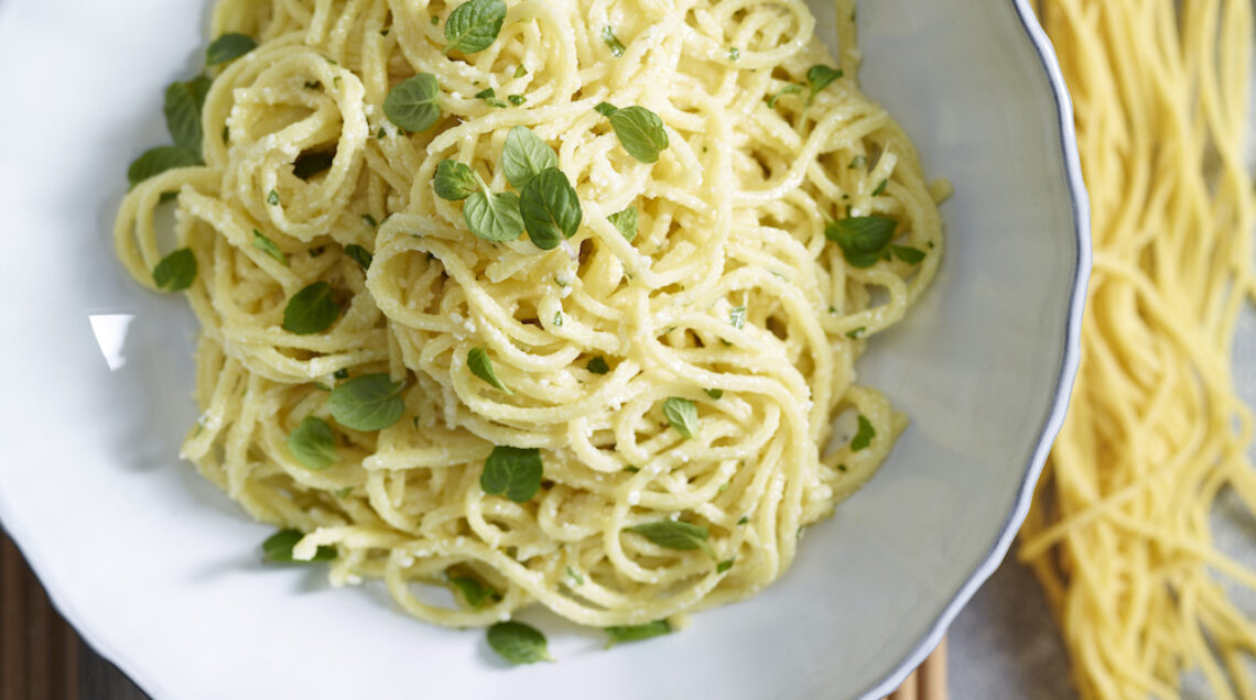 1) Preparazione spaghetti alla chitarra con lime, menta e zenzero. Impastate la farina con le uova, aggiungendo un goccio d'acqua, se occorre. Lavorate gli ingredienti con una forchetta e poi con le mani per 5-6 minuti. Formate una palla, avvolgetela in pellicola da cucina e lasciatela riposare per 30 minuti, .