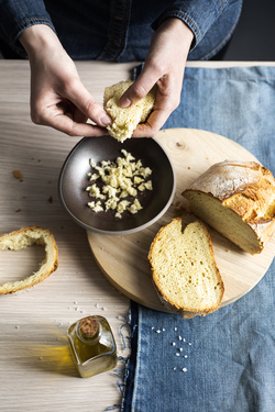 1) Private le fette di pane della crosta, sminuzzate grossolanamente la mollica e friggete le briciole in padella con 3-4 cucchiai d'olio, finché risulteranno dorate e croccanti. Tenetele da parte. Mettete a bollire l'acqua in una pentola, quando bolle salatela e buttate la pasta.