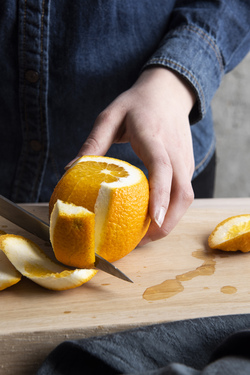 2) Intanto, lavate le arance, grattugiate la scorza di una e tenetela da parte. Pelatele al vivo e mettete gli spicchi in una larga padella con il succo d'arancia; unite gli spicchi d'aglio sbucciati e schiacciati, le alici sgocciolate, 80 ml circa d'olio, le olive, metà scorza di arancia grattugiata e metà del finocchietto tritato.