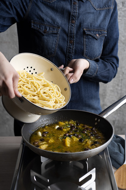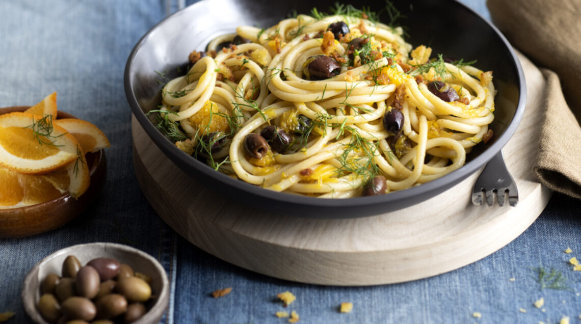 Se siete degli amanti della pasta questa ricetta originale è ciò che fa per voi: condite gli spaghetti con olive taggiasche, fettine di arancia spadellate e finocchietto. Guarnite il piatto con briciole di pane fritto e scorza di arancia.