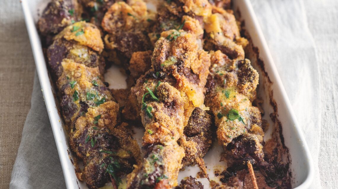 3) Infilate sugli stecchini i rotolini di fegato preparati alternandoli ai mucchietti di lardo (o i cubetti).