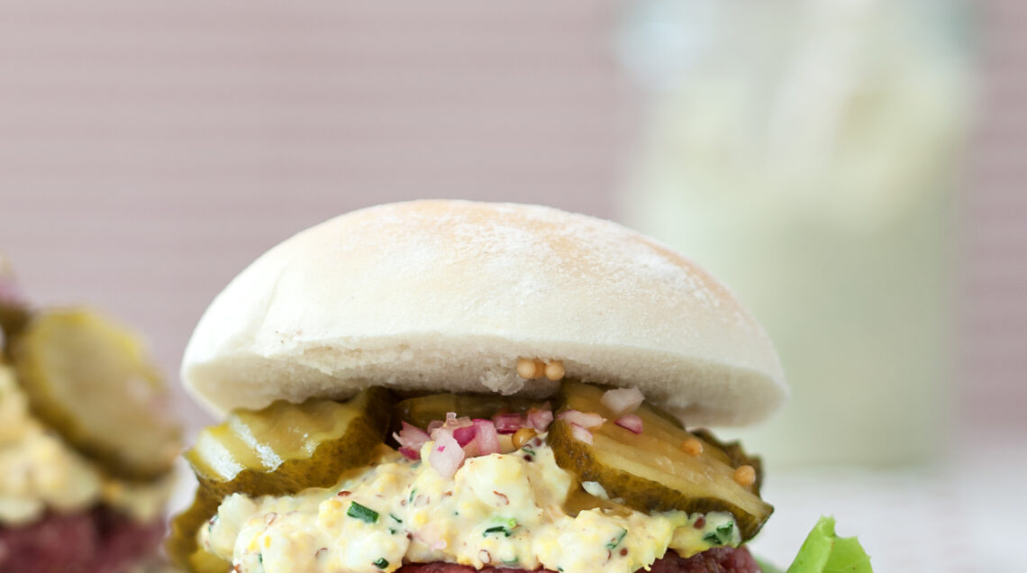 1) Sgusciate le uova, schiacciatele con la forchetta, conditele con la senape, la maionese e l'erba cipollina tagliuzzata con le forbici. Tritate la cipolla rossa e conditela con un pizzico di sale e il succo di limone e unitela al mix preparato. Aggiungete i capperi tritati e la carne cruda, mescolate, regolate di sale, pepate e formate 4 hamburger.