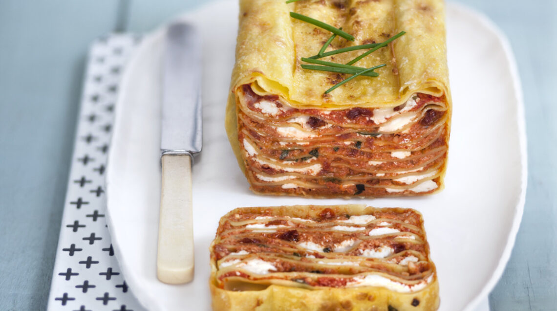 3 Spalmate un primo strato di pesto e cospargetelo con fiocchetti di ricotta, un pizzico di parmigiano, una foglia di basilico spezzettata, un pizzico di erba cipollina tagliuzzata e, se vi piace, qualche pezzetto di pomodoro secco; fate altri strati, tagliando a misura le sfoglie di pasta, fino a terminare gli ingredienti.