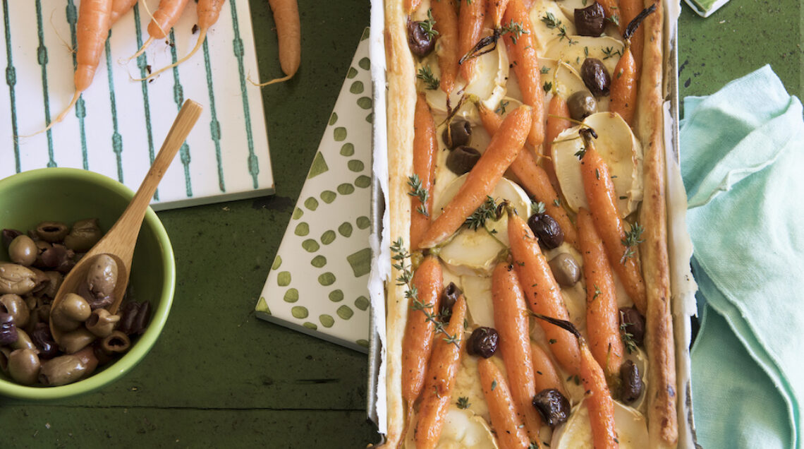 4) Mescolate la ricotta con la scorza d'arancia, il timo, sale e pepe e stendetela sulla base di pasta. Distribuitevi sopra lo chèvre a fettine, quindi le carotine caramellate con il loro sughetto, le olive e qualche rametto di timo. Infornate nuovamente per 20 minuti e servite tiepido.