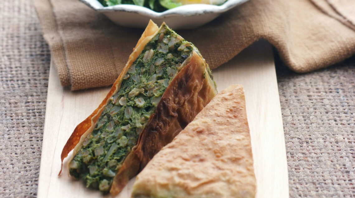 2) Mescolate il farro con la ricotta, le uova sbattute e il parmigiano; salate e pepate. Ritagliate nella pasta fillo 4 dischi della stessa misura dello stampo (circa 20 cm) e abbinateli due a due "incollandoli" con un velo di olio. Disponete un doppio disco nello stampo unto d'olio, versate il ripieno e coprite con il doppio disco rimasto. Spennellate con olio e cuocete a 180° 45 minuti.